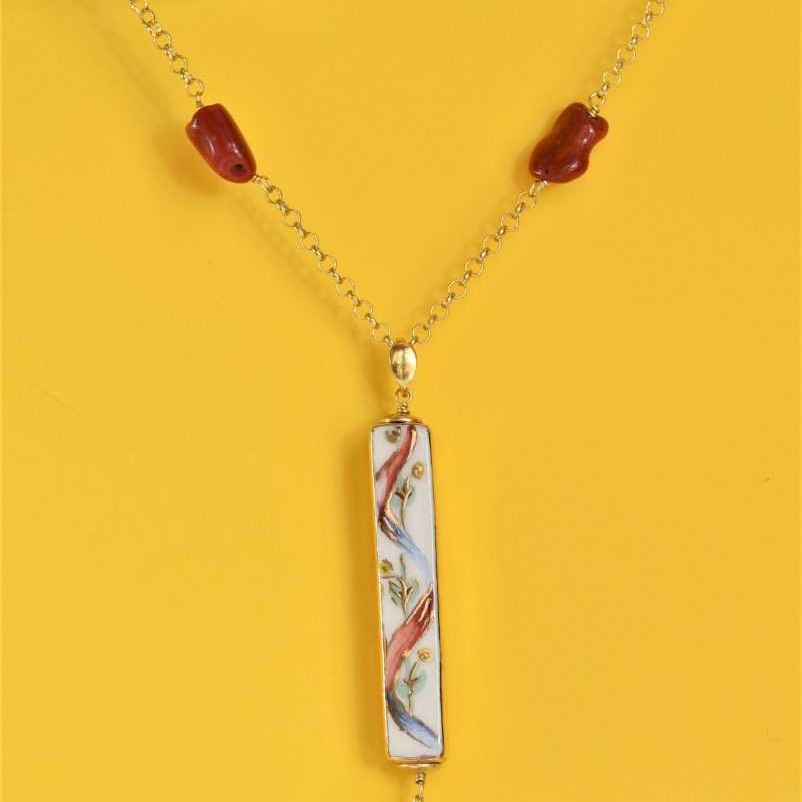 Choker con pendente in ceramica dipinta a mano oro puro a terzo fuoco e corallo del Mediterraneo. Lunghezza della collana: 52 cm Diametro della perla: 13 mm Misure dell’elemento in ceramica: 4,5 cm GTIN 8050247470915 Ho trovato la ispirazione della mia linea negli affreschi della Domus Aurea di Nerone, e ho dipinto minuziosamente i dettagli sulla ceramica, rendendoli eterni. Dettagli e motivi decorativi a grottesche che il mondo ci invidia. Piccoli capolavori riproposti nell’arte rinascimentale, che il mondo ci invidia. La grande perla naturare è il tocco finale che dona femminilità, mentre il corallo rende questo gioiello “sine tempore”, davvero prezioso. Gli accenti d’oro fanno un meraviglioso riflesso, quando si incontrano con la luce. I due lati sono dipinti con abbondante oro 24k. L’elemento in ceramica, con una grande quantità d’oro applicato a pennello, è stato realizzato in tre diverse cotture, fino a 1300 °C per rendere la ceramica durevole e resistente. Colori apiombici, smalti e lustri hanno la certificazione europea Reach.