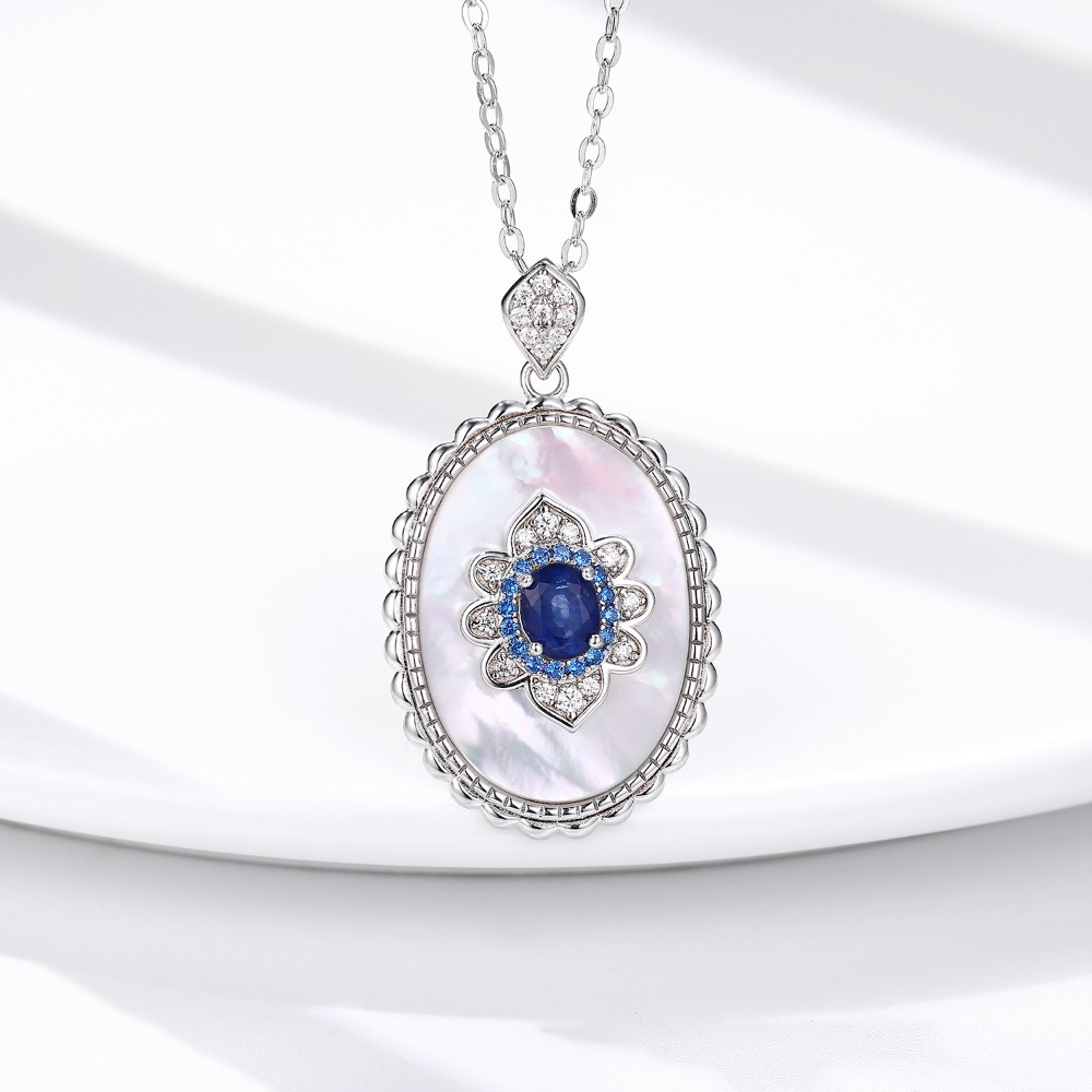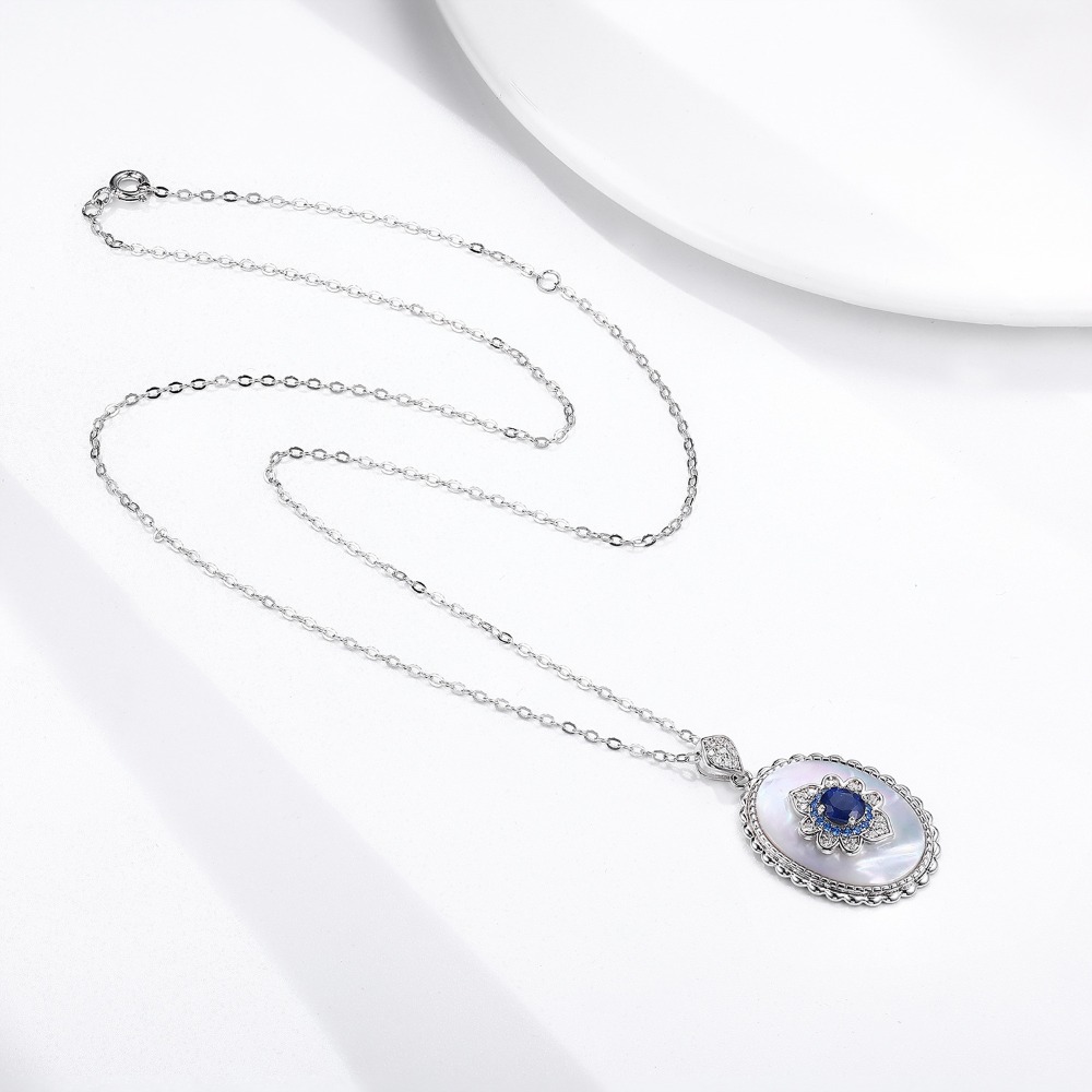 Oval Mother-of-pearl Sapphire Diamond Pendant Necklace, 925 Sterling Silver Chain Women Jewelry