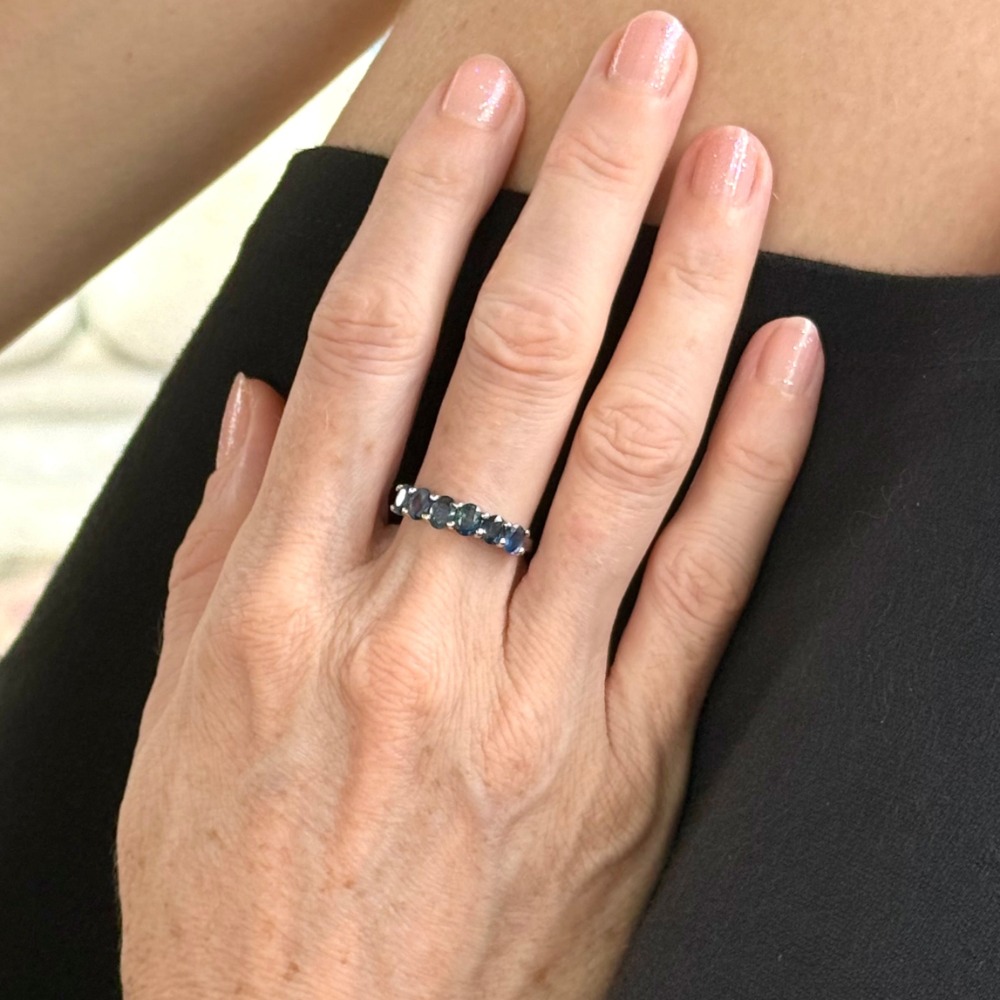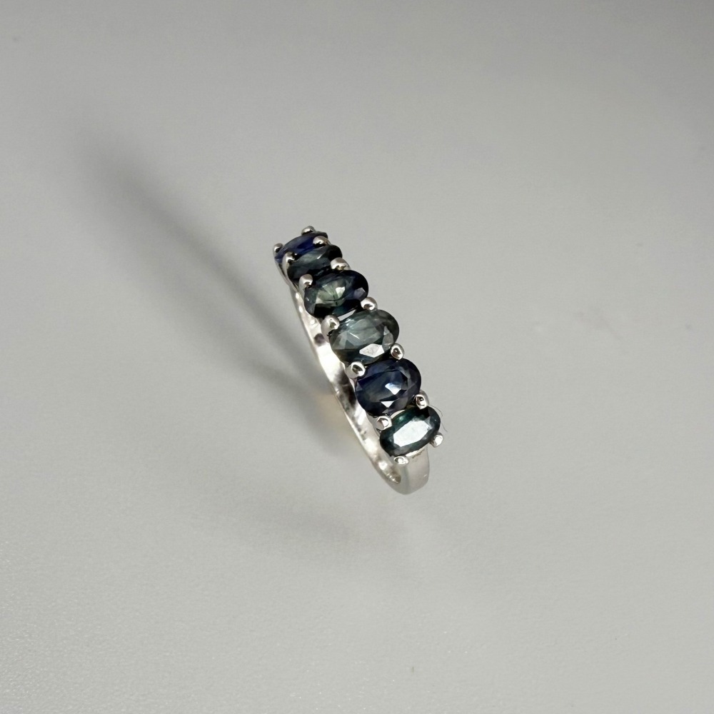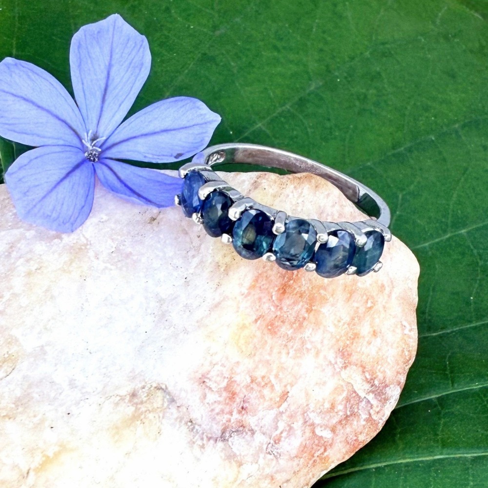 This ring captures the enduring beauty of sapphire in a refined silver setting. Crafted in white gold-plated sterling silver, it features a row of natural Blue Sapphires from our Sapphire Collection that radiate quiet strength and timeless elegance. Designed to complement both everyday wear and evening sophistication, it’s a piece that speaks of confidence and grace.